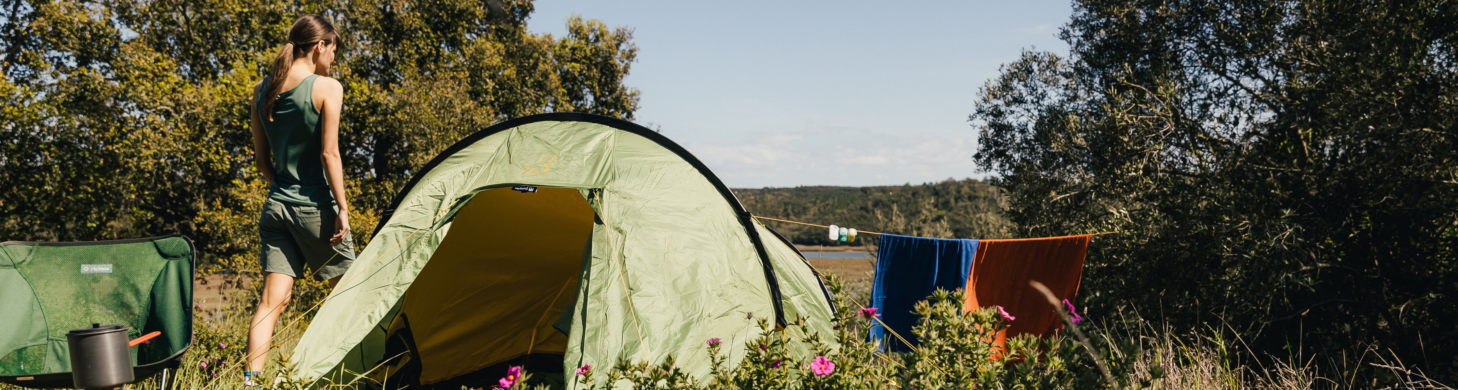TIP: Plaats je tent nooit in een kuil – overstromingsgevaar! – of onder een boom met veel dode takken, die bij de minste windstoot naar beneden kunnen vallen. Zet de ingang van je tent ook steeds weg van de richting waaruit de wind waait.