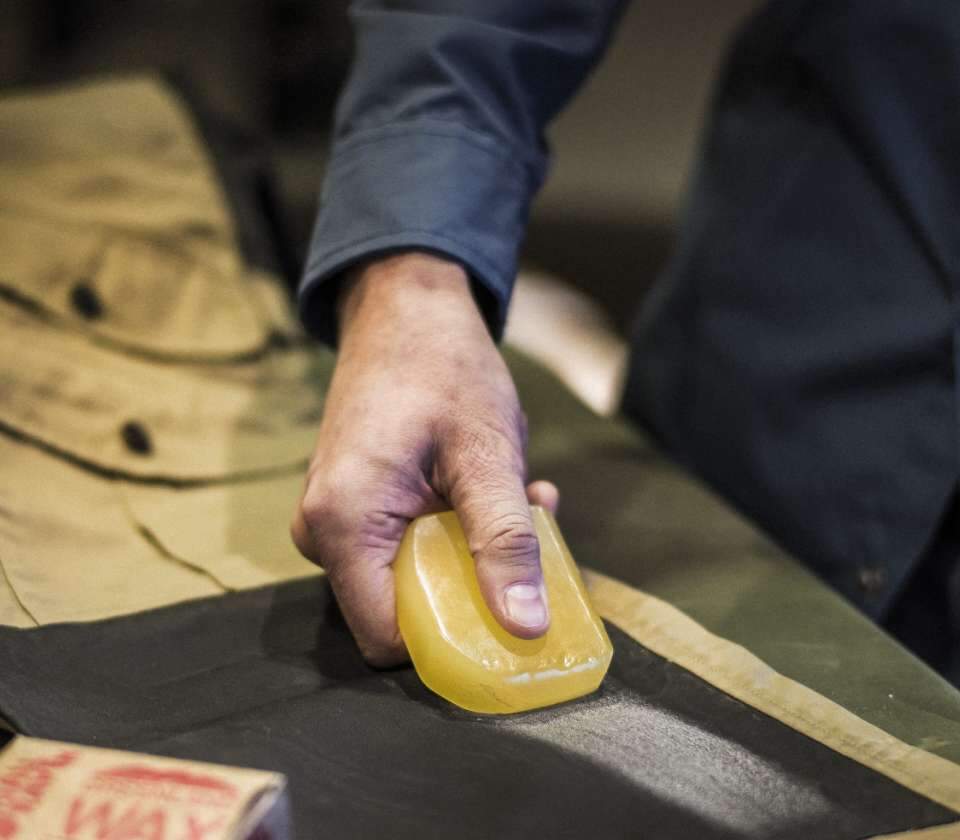 Breng een dunne, gladde laag wax aan door de blok Greenland Wax met lange, gelijkmatige bewegingen over de stof te wrijven. Zet gerust een beetje druk indien nodig, maar zorg dat het resultaat niet slordig wordt.