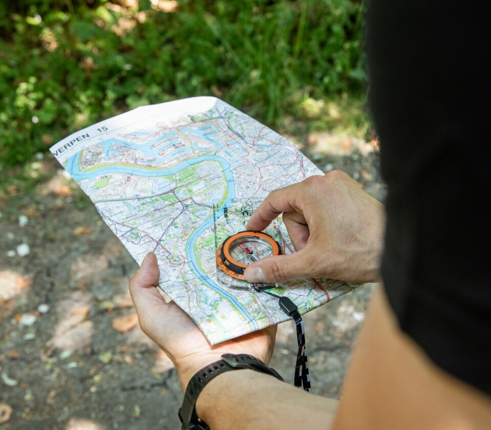 “Een kompas werkt op basis van magnetisme: de naald van het kompas zoek het magnetische noorden op”, legt Brecht uit. “Metaal of andere magneten brengen een kompas uit balans. Breng je je kompas bijvoorbeeld te dicht bij je smartphone, een fiets of zelfs een knoop aan je kleding, dan raakt de naald van slag en kan het resultaat afwijken. Twee kompassen in elkaars buurt houden is daarom ook geen goed idee want ze beïnvloeden elkaar en het resultaat.”